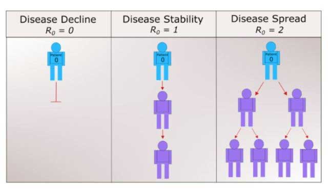 例如,假設(shè)某人A生病并且我們的系統(tǒng)的R0 = 2。這意味著A將感染兩個人。這兩個人將依次感染四個人,每個人將另外感染兩個人(因此4 * 2 = 8),依此類推。這凸顯了該疾病的傳播是乘法而不是累加的事實。R0可以捕獲三種基本情況,如圖2所示。
