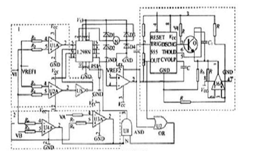 2)在虛線(xiàn)2的框圖中,兩個(gè)比較器U3AU4A形成雙極限比較器。當(dāng)VB<vi<va, the="" output="" is="" low.="" when="" vi="">  <vb, the="" output="" is="" high.="" va,="" vb="" upper="" and="" lower="" limits="" of="" <="" span="">爐壓力傳感器轉(zhuǎn)換的電壓,即反應(yīng)堆主體的壓力控制范圍。根據(jù)過(guò)程要求,我們可以指定值只要爐子的壓力在VAVB之間,就可以達(dá)到VAVB的水平。電機(jī)停止(注意VB<vrbf1<va, if="" it="" is="" not="" within="" this="" range,="" <="" span="">系統(tǒng)不穩(wěn)定)。