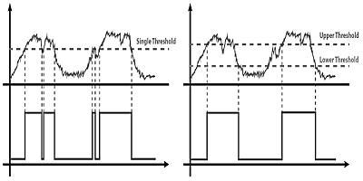 比較器輸出無(wú)遲滯(左)和有遲滯(右)