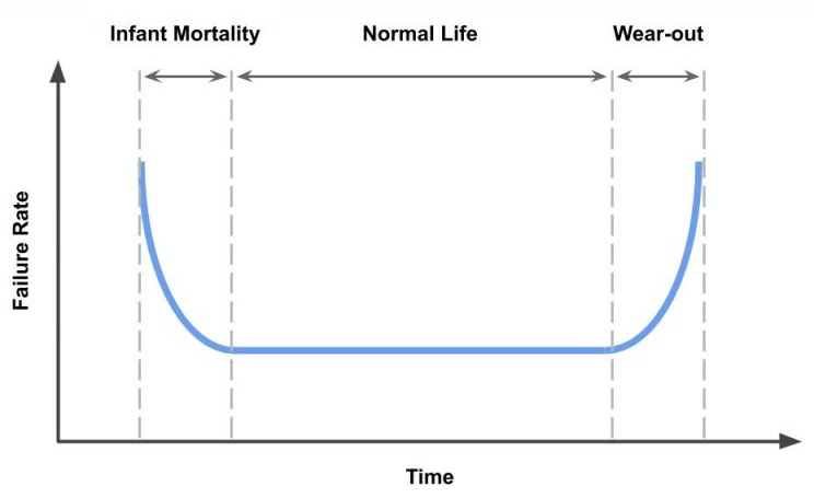 這些可靠性測(cè)試的目的是收集足夠的數(shù)據(jù)以形成浴盆曲線(示例如下所示)。不幸的是,嬰兒死亡率部分包括由于制造缺陷而導(dǎo)致的早期組件故障。這些測(cè)試通常在125°C下進(jìn)行。